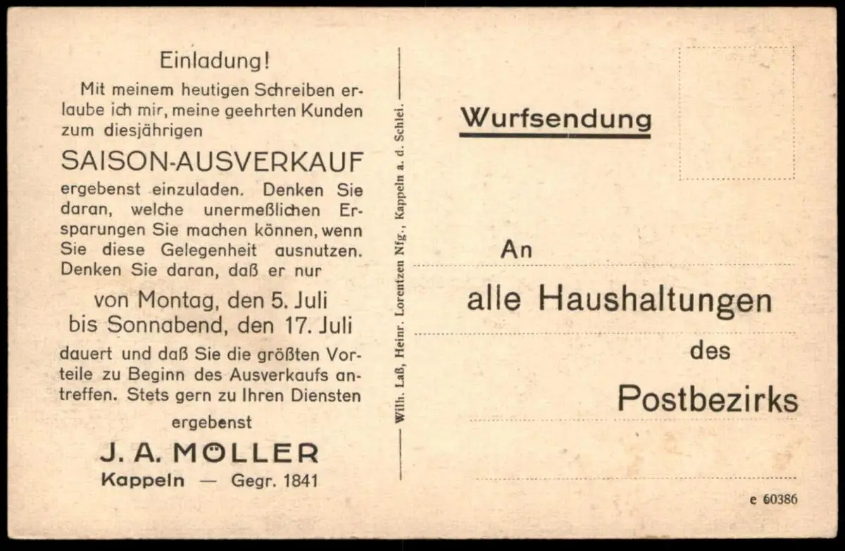 Verlag: Wilh. Laß, Heinr. Lorentzen Nachf. Kappeln Gelaufen: nein, Wurfsendung an alle Haushaltungen des Postbezirks. Einladung Saison-Ausverkauf J. A. MöllerErhaltung (s. Scan): gut - sehr gut / 917157
