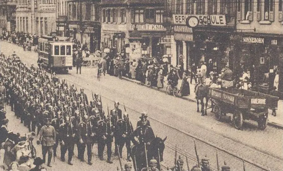 ALTE POSTKARTE KARLSRUHE KAISERSTRASSE PARADE VON SOLDATEN LEERE BIERKUTSCHE MONINGER SONNEBORN SCHULE ALBERT KNAUx