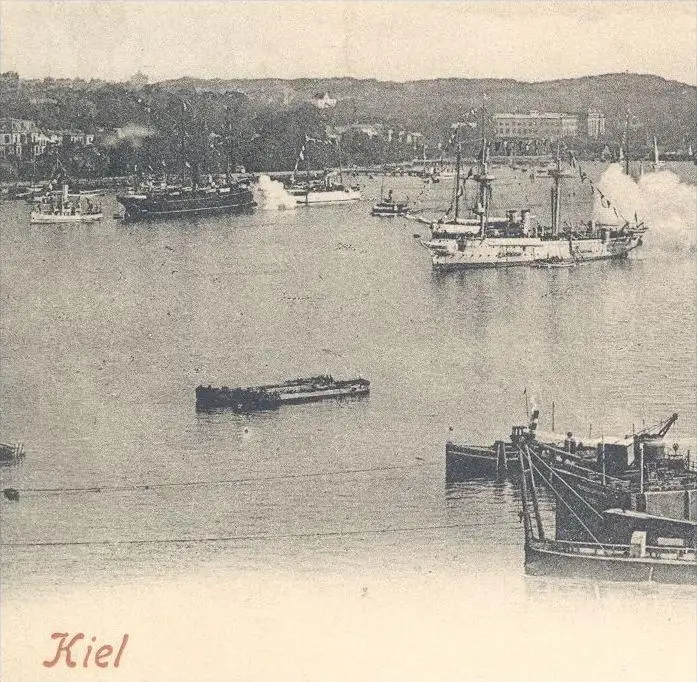 ALTE POSTKARTE KIEL KRIEGSHAFEN KAISERSALUT SCHLACHTSCHIFF Kriegsschiff battle ship bateau schip warship marine port