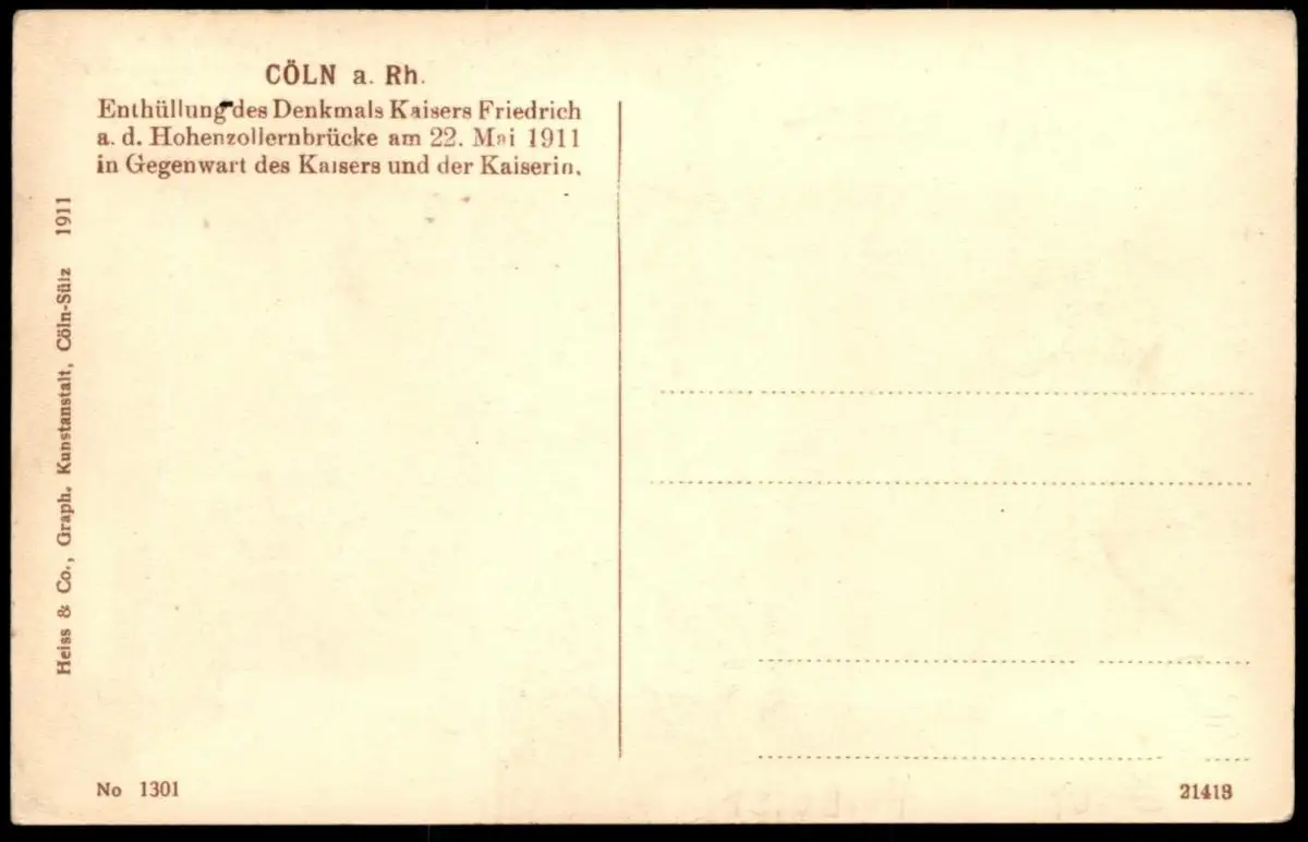 ALTE POSTKARTE KÖLN BESUCH DES KAISERPAARES BEI DER ENTHÜLLUNG DES DENKMALS KAISER FRIEDRICHS AN DER HOHENZOLLERNBRÜCKE AM 22. MAI 1911, Vortrag des Kölner Männer-Gesang-VereinsVerlag: Heiss & Co., Cöln-Sülz 1911