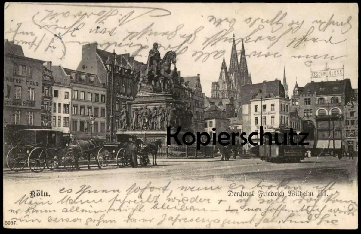 ALTE POSTKARTE KÖLN DENKMAL FRIEDRICH WILHELM III. HEUMARKT STRASSENBAHN SCHUHWAREN-HAUS ZUM GROSSEN STIEFELVerlag: unbekannt