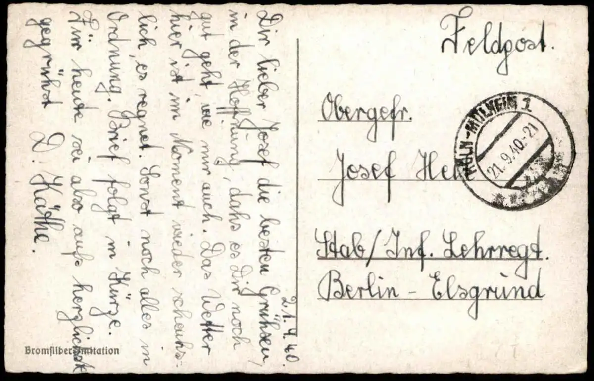 Gelaufen: 21.09.1940 als Feldpost mit Stempel Köln-Mülheim nach Stab / Inf.Lehrregiment Berlin-Elsgrund