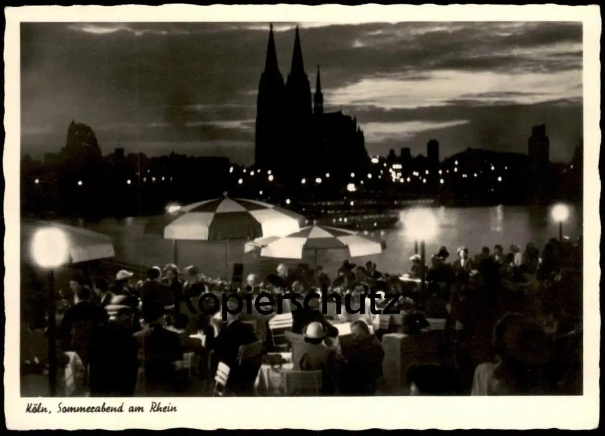 ALTE POSTKARTE KÖLN SOMMERABEND AM RHEIN ABEND NACHT BlICK AUF DOM Tanzbrunnen ? Rheinpark ?