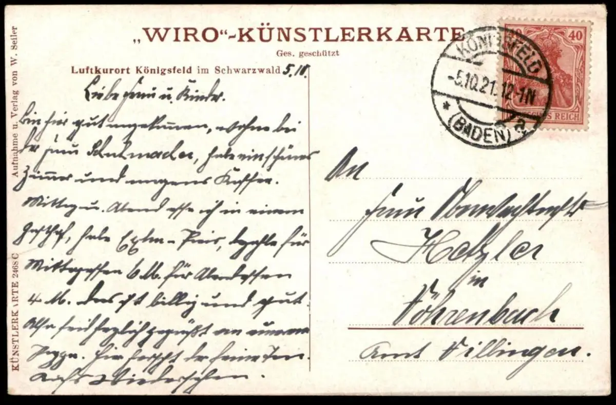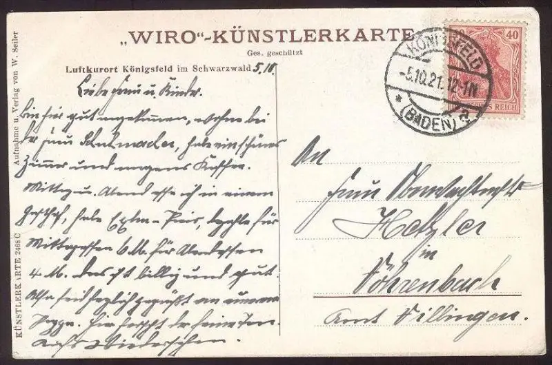 Gelaufen: 05.10.1921 mit Stempel Königsfeld Baden nach Föhrenbach