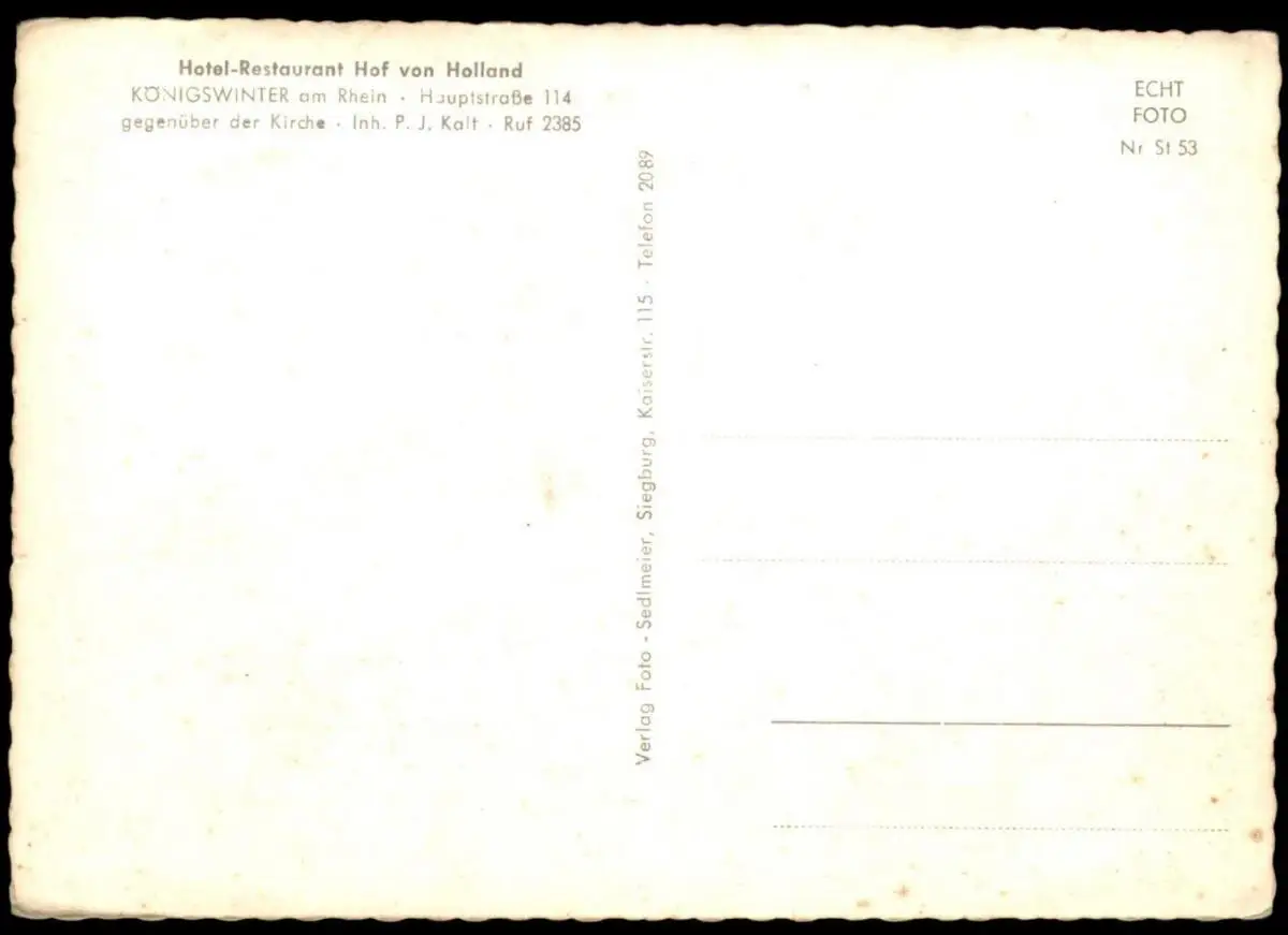 ALTE POSTKARTE KÖNIGSWINTER AM RHEIN HOF VON HOLLAND HOTEL RESTAURANT Hauptstrasse 114 gegenüber der Kirche, Inhaber P. J. KaltVerlag: Foto Sedlmeier, Siegburg, Kaiserstr. 115