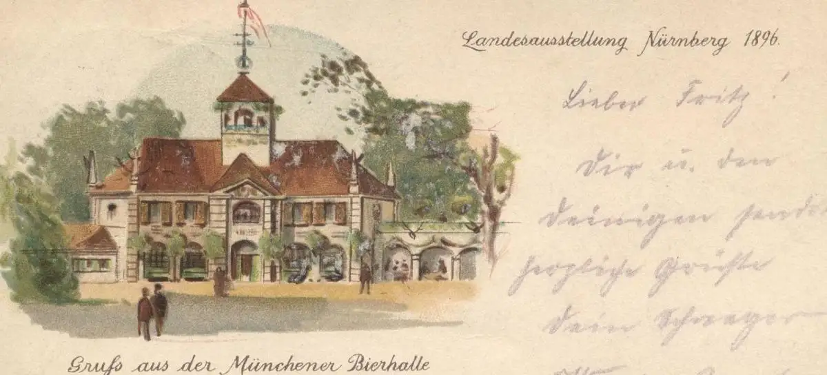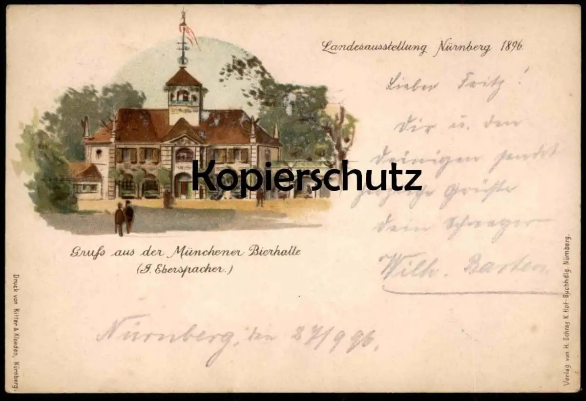 ALTE POSTKARTE LANDESAUSSTELLUNG NÜRNBERG 1896 GRUSS AUS MÜNCHENER BIERHALLE SONDERSTEMPEL Ansichtskarte postcard cpa AK
