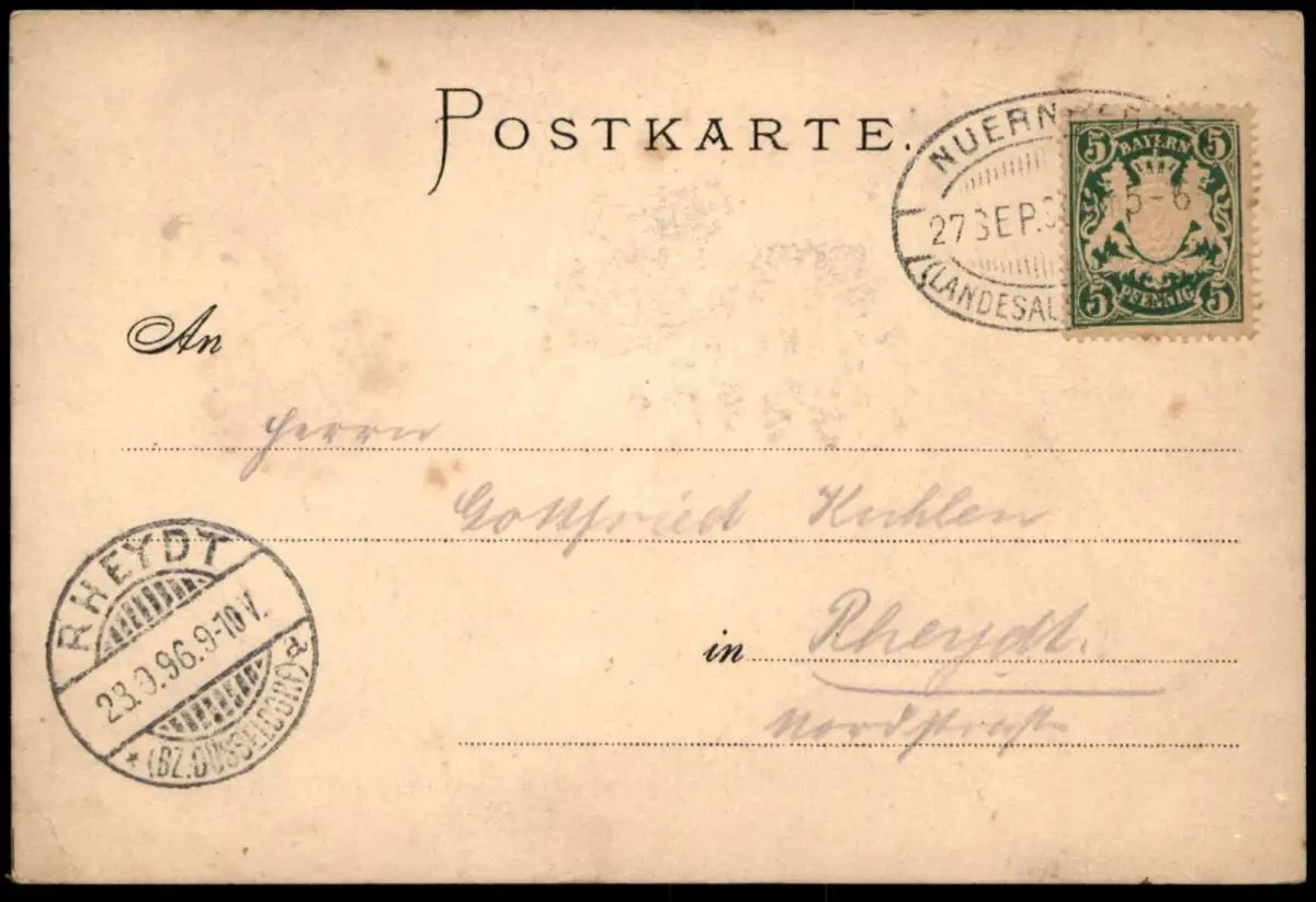 Gelaufen: 27.09.1896 mit Sonderstempel Landesausstellung Nürnberg nach Rheydt