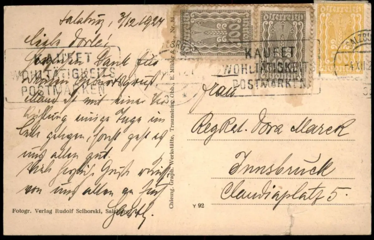 Gelaufen: 31.12.1927 mit Stempel Salzburg sowie Freimarken & Werbestempel "Kaufet Wohltätigkeits Postmarken" nach Innsbruck