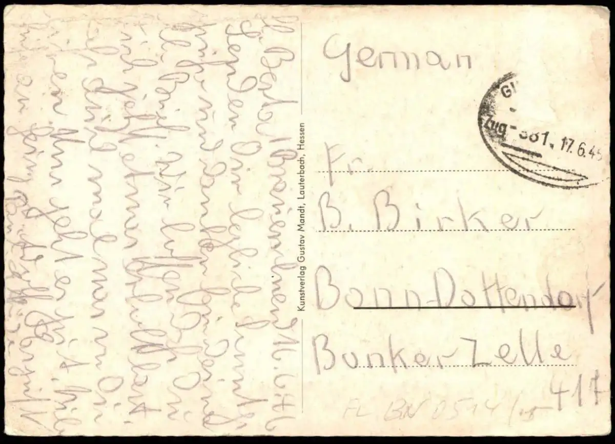 Gelaufen: 17.06.1946 mit Bahnpoststempel nach Bonn Dottendorf adressiert an Bunker Zelle 417, Briefmarke mit leichten Spuren entfernt
