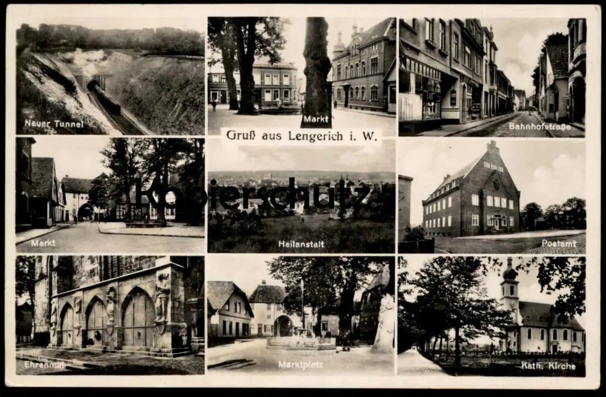 ALTE POSTKARTE LENGERICH IN WESTFALEN NEUER TUNNEL BAHNHOFSTRASSE POSTAMT EHRENMAL MARKT HEILANSTALT MARKTPLATZ KATHOLISCHE KIRCHEVerlag: Hermann Lorch, Dortmund