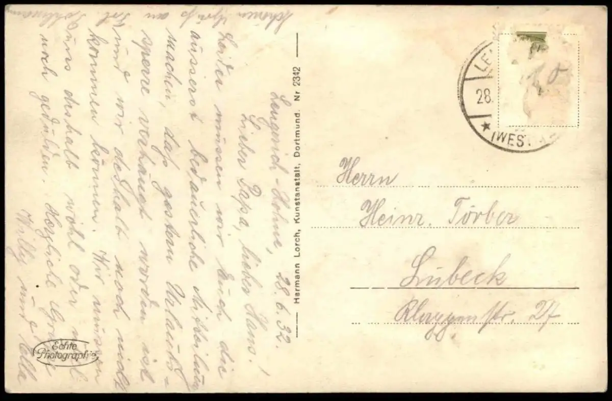 Gelaufen: 28.06.1932 mit Stempel Lengerich nach Lübeck, Briefmarke (sauber) entfernt