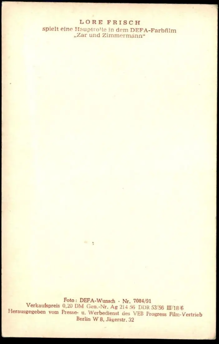 ALTE POSTKARTE LORE FRISCH FILM-SCHAUSPIELERIN DEFA FILM ZAR UND ZIMMERMANNVerlag: DEFA-Wunsch, Presse- und Werbedienst des VEB Progress Film-Vetrieb, Berlin