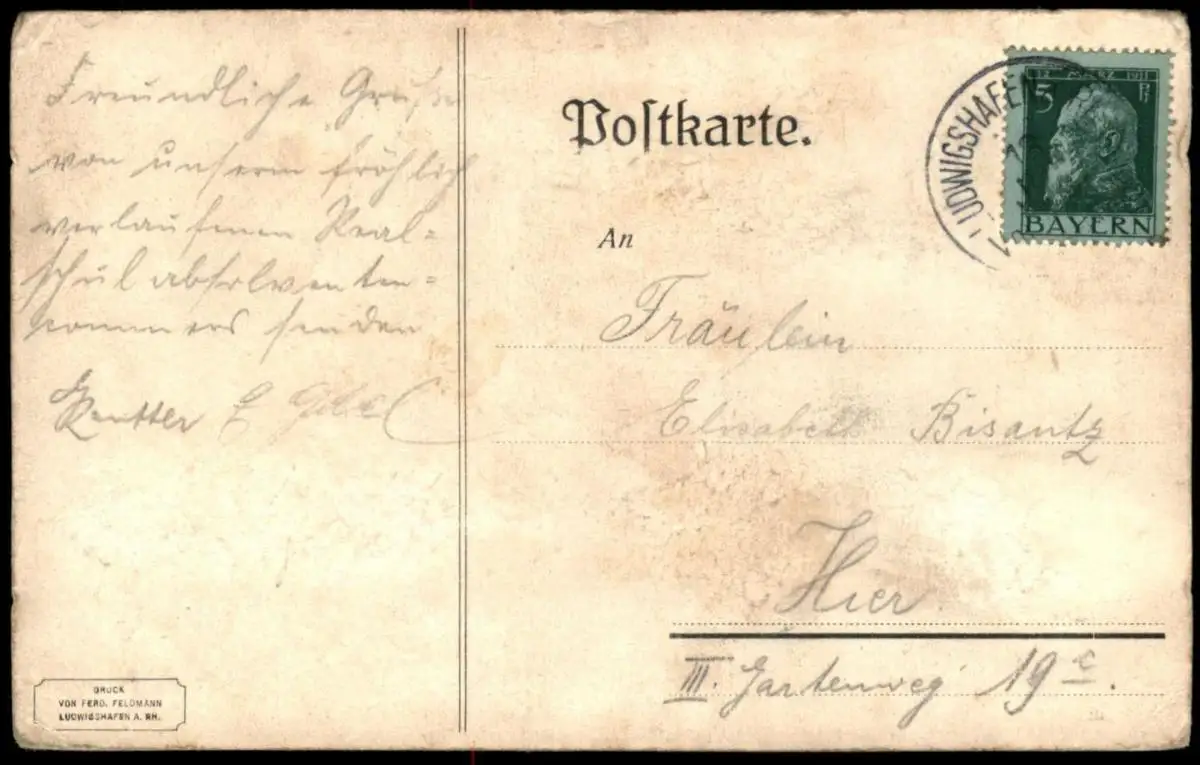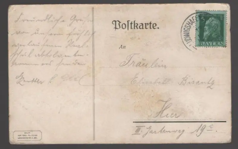 Gelaufen: 18.07.1913 mit Stempel Ludwigshafen nach LudwigshafenErhaltung (s. Scan): gut - mittel, Ränder leicht bestoßen, minimaler Abrieb im Anschriftenfeld / 916033