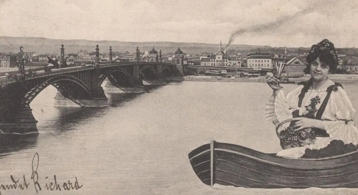 ALTE POSTKARTE MAINZ KASTEL AM RHEIN WEINKÖNIGIN AUF BOOT FRAU Rheinwein Ansichtskarte cpa postcard AK