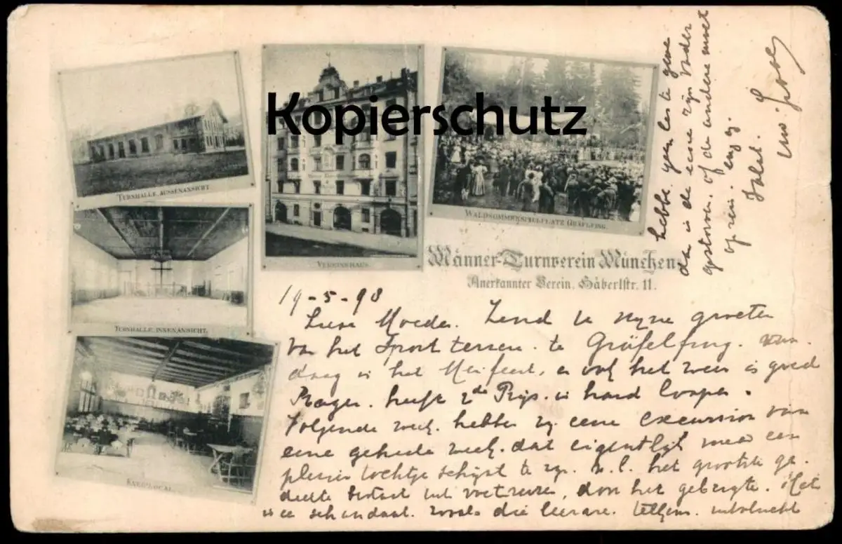 ALTE POSTKARTE MÄNNER TURNVEREIN MÜNCHEN TURNHALLE AUSSENANSICHT INNENANSICHT KNEIPLOCAL VEREINSHAUS WALDSOMMERSPIELPLATZ GRÄFLINGVerlag: unbekannt
