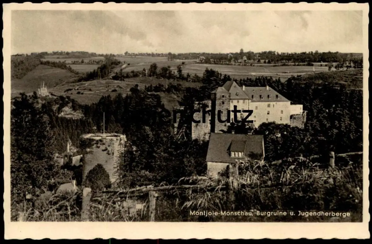 ALTE POSTKARTE MONTJOIE MONSCHAU BURGRUINE UND JUGENDHERBERGEVerlag: Kunstanstalt und Großverlag Jacob Krapohl, M.-Gladbach