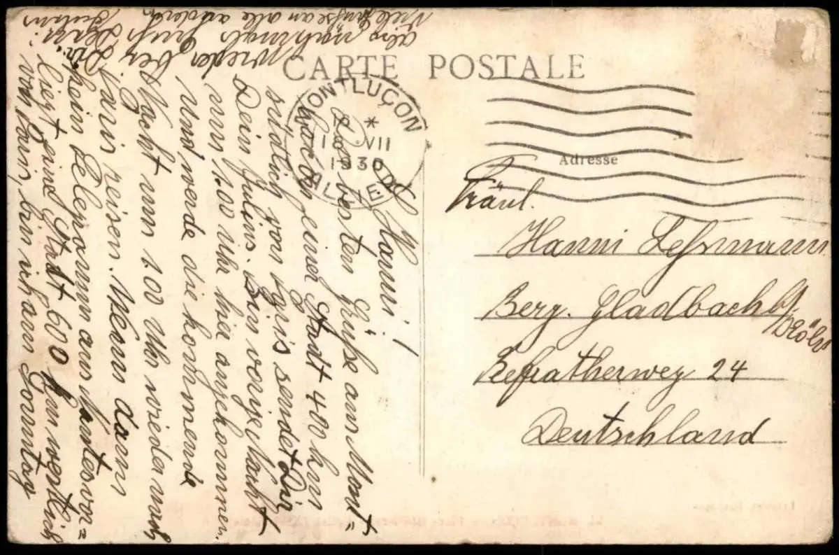 Gelaufen: 18.07.1930 mit Stempel Montlucon nach Bergisch Gladbach, Briefmarke entfernt
