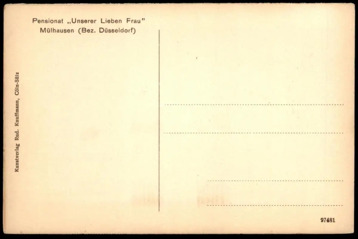 ALTE POSTKARTE KLOSTERKIRCHE UND VORGARTEN PENSIONAT UNSERER LIEBEN FRAU MÜLHAUSEN BEZIRK DÜSSELDORFVerlag: Rud. Knuffmann, Cöln-Sülz