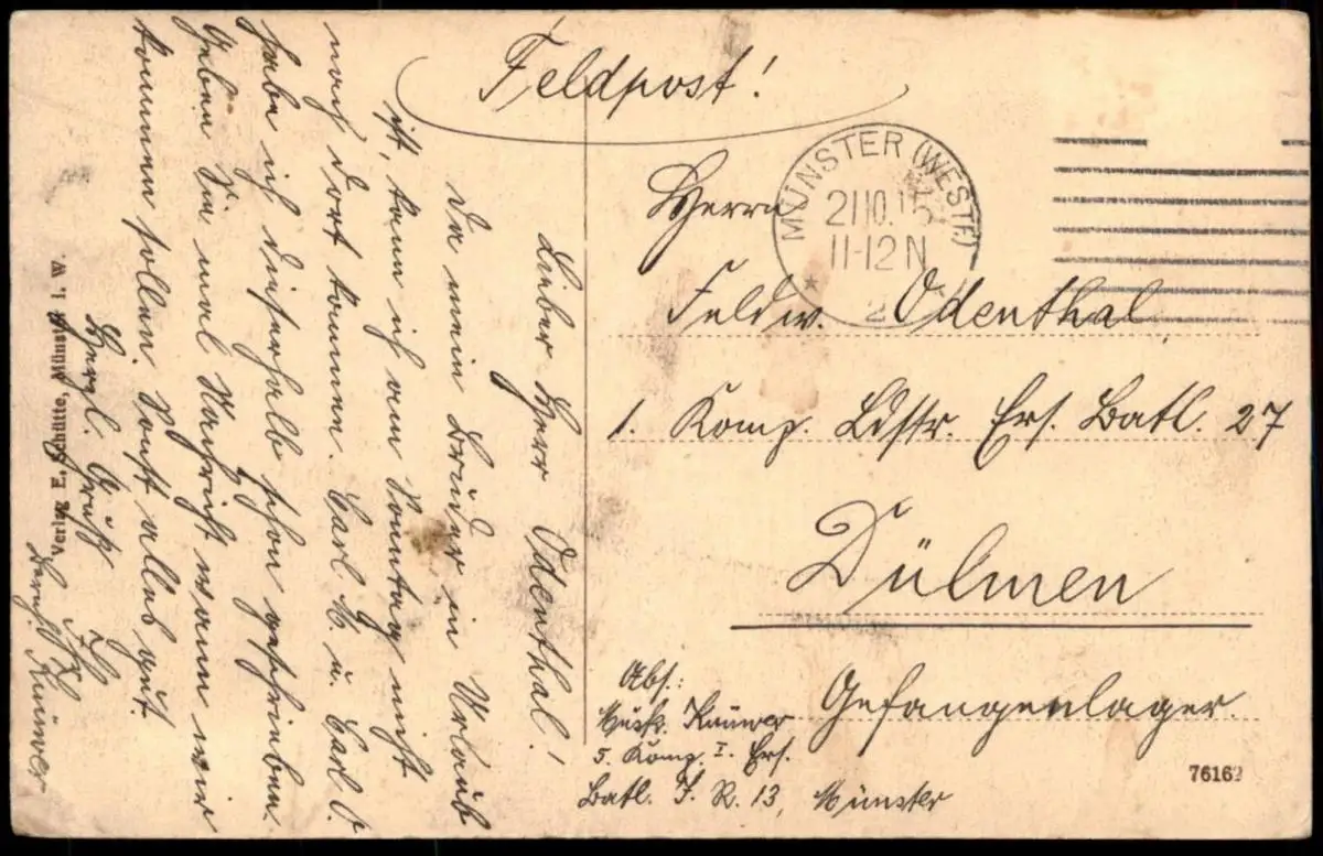 Gelaufen: 21.10.1915 als Feldpost mit Stempel Münster nach Dülmen Gefangenenlager