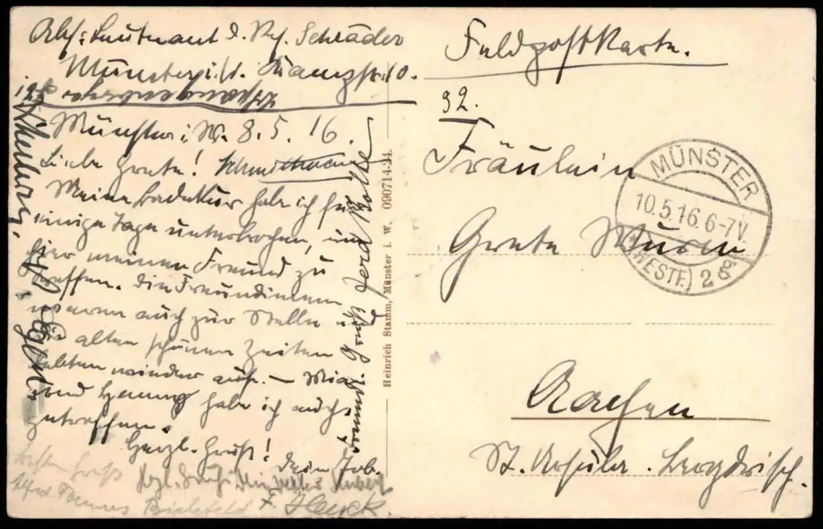 Gelaufen: 10.05.1916 als Feldpost mit Stempel Münster nach Aachen