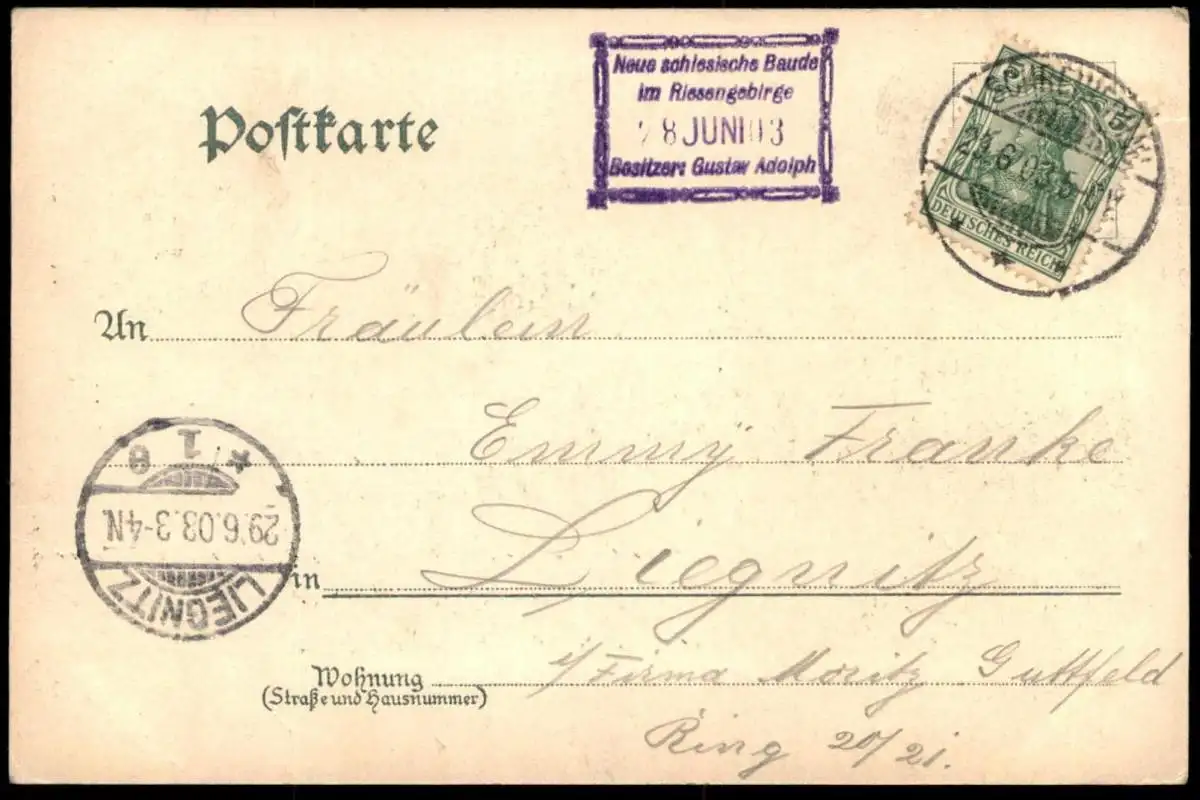 Gelaufen: 29.06.1903 mit Stempel Hirschberg nach Liegnitz
