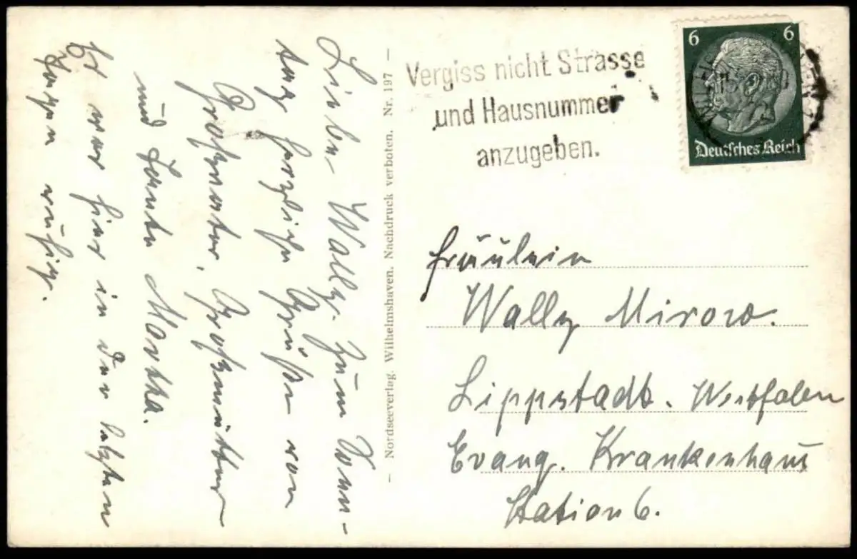 Gelaufen: xx.xx.1938 mit Maschinenwerbestempel "Vergiss nicht Strasse und Hausnummer anzugeben" nach Lippstadt Evangelisches Krankenhaus Station 6