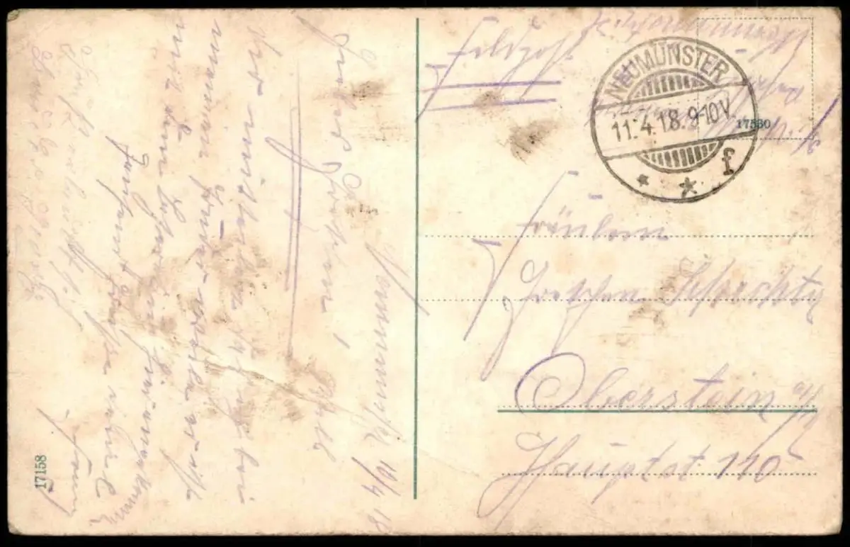 Gelaufen: 11.04.1918 als Feldpost mit Stempel Neumünster nach Oberstein
