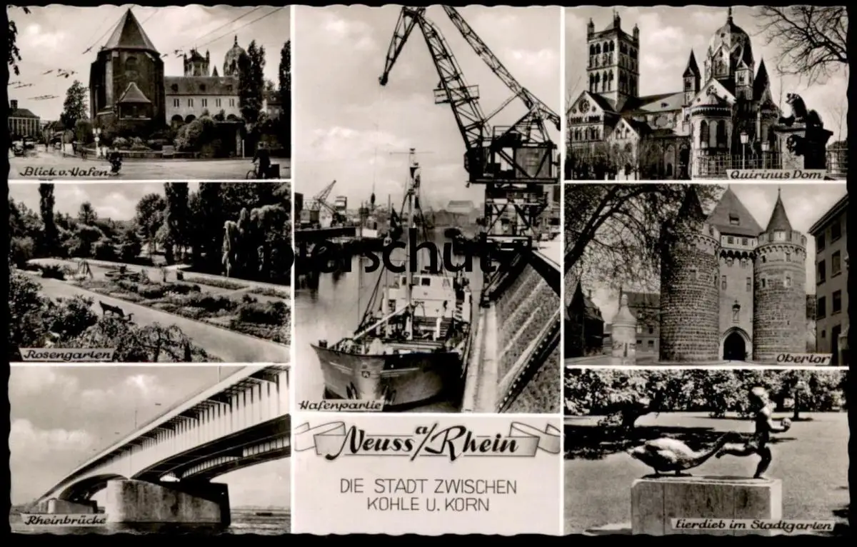 ÄLTERE POSTKARTE NEUSS AM RHEIN DIE STADT ZWISCHEN KOHLE UND KORN EIERDIEB IM STADTGARTEN OBERTOR QUIRINUS DOM BLICK VOM HAFEN ROSENGARTEN HAFENPARTIE RHEINBRÜCKEVerlag: Th. Gerhards, Neuss