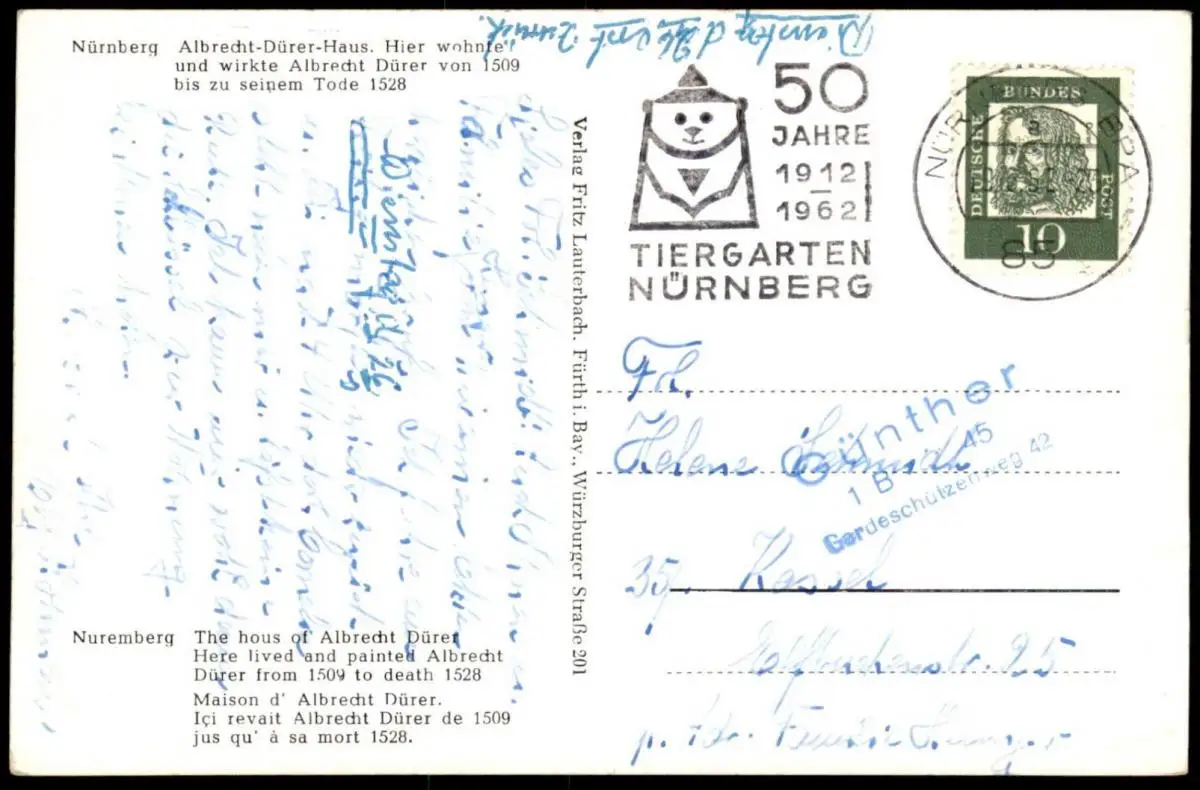 Gelaufen: 19.06.1962 nach Kassel mit Stempel Nürnberg sowie 50 Jahre Tiergarten Nürnberg 1912 - 1962Erhaltung (s. Scan): gut - sehr gut / 916271