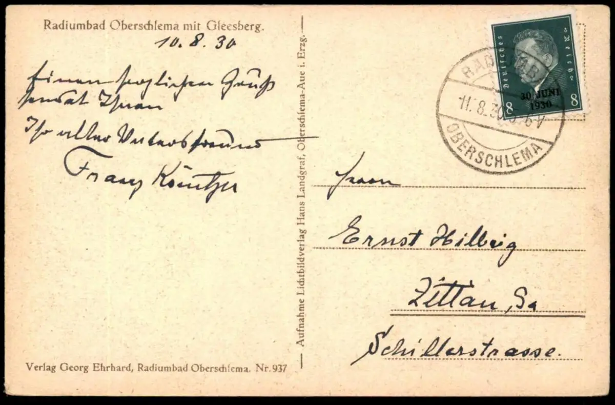 Gelaufen: 11.08.1930 mit Stempel Radiumbad Oberschlema nach Zittau