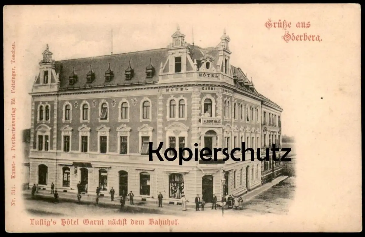ALTE POSTKARTE ODERBERG SCHLESIEN LUSTIG´S HOTEL ALBERT HAAS GARNI NÄCHST DEM BAHNHOF