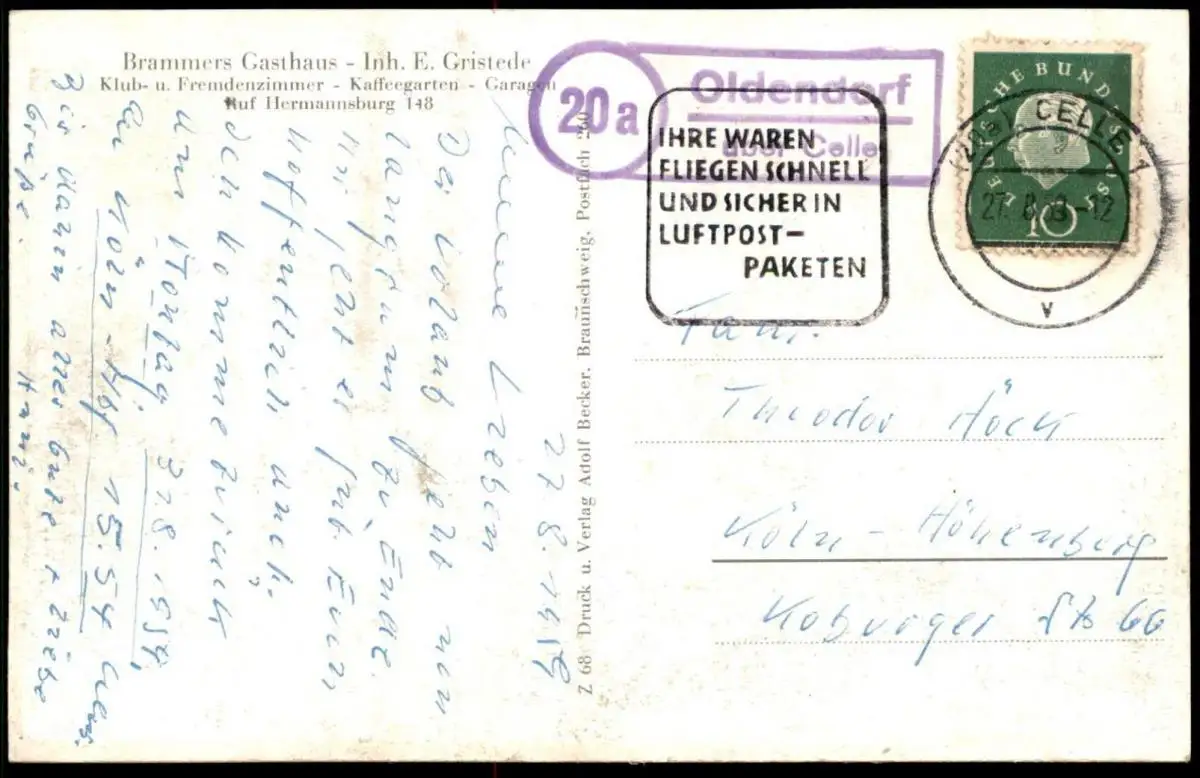 Gelaufen: 27.08.1959 mit Rechteckstempel Oldendorf 20 a über Celle sowie Maschinenwerbestempel Celle "Ihre Waren fliegen schnell und sicher in Luftpost-Paketen" nach Köln Höhenberg