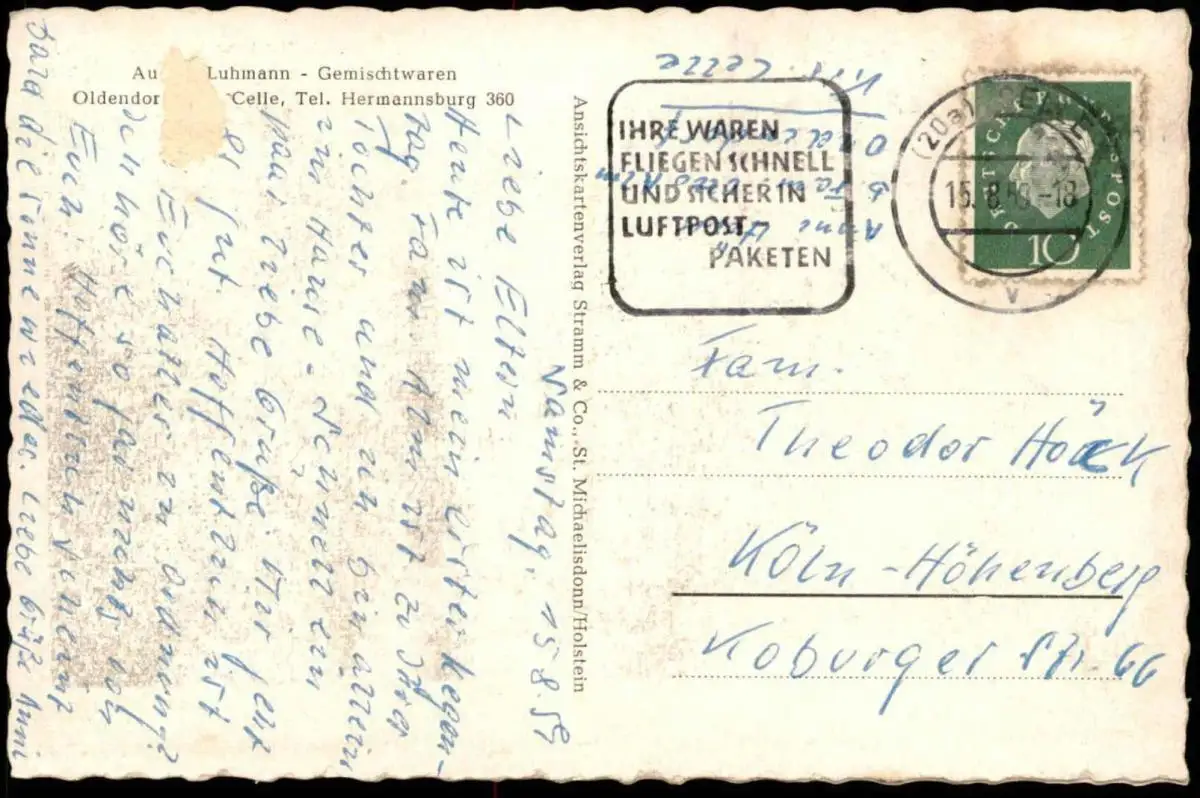 Gelaufen: 15.08.1959 mit Stempel Celle nach Köln Höhenberg