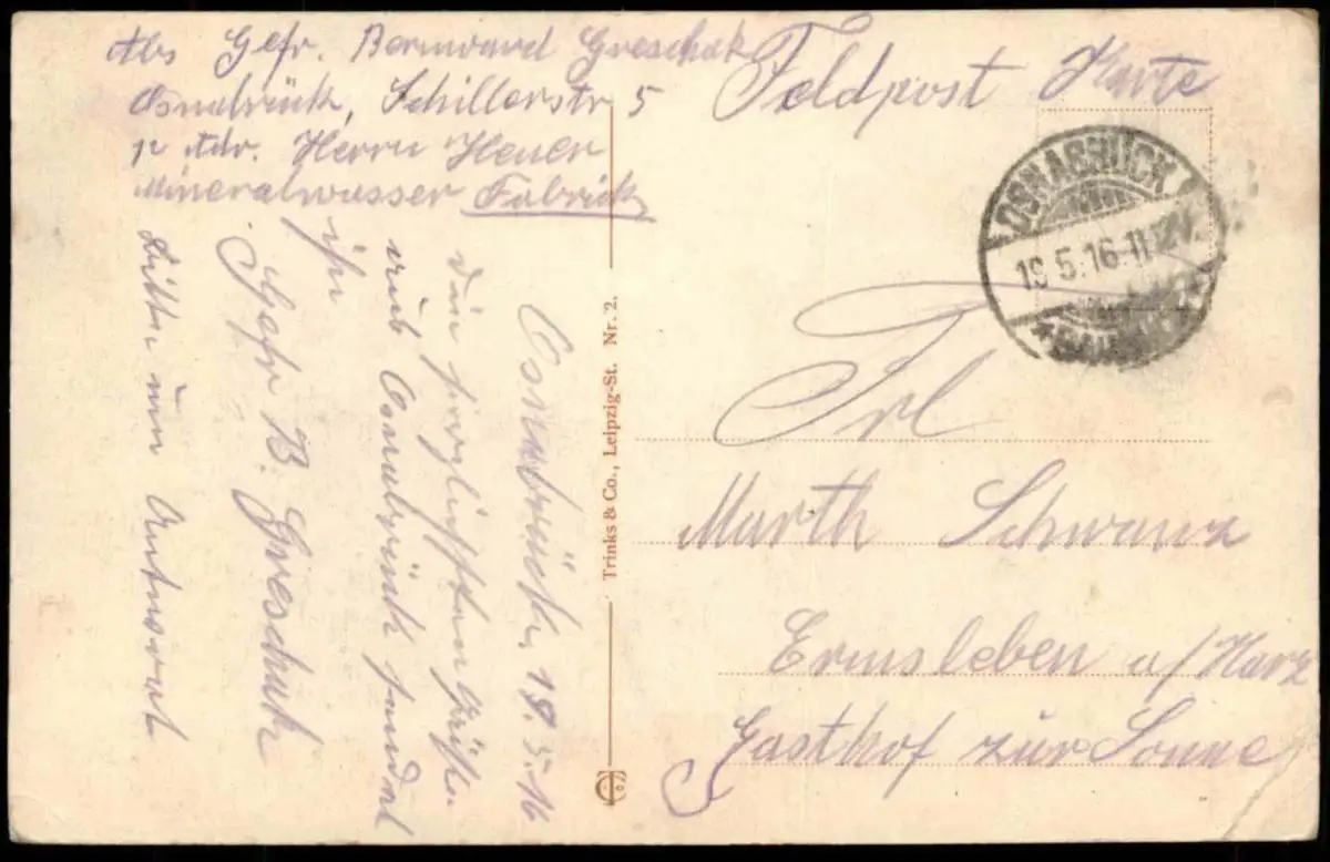 ALTE POSTKARTE OSNABRÜCK NICOLAIORT HETTLAGE & LAMPE, CONRAD TACK, J. KIEFER, M. NIEMEYERVerlag: Trinks & Co., LeipzigGelaufen: 19.05.1916 mit Stempel Osnabrück als Feldpost nach Ermsleben a. HarzErhaltung (s. Scan): gut - mittel, linke untere Ecke etwas bestoßen / 915692