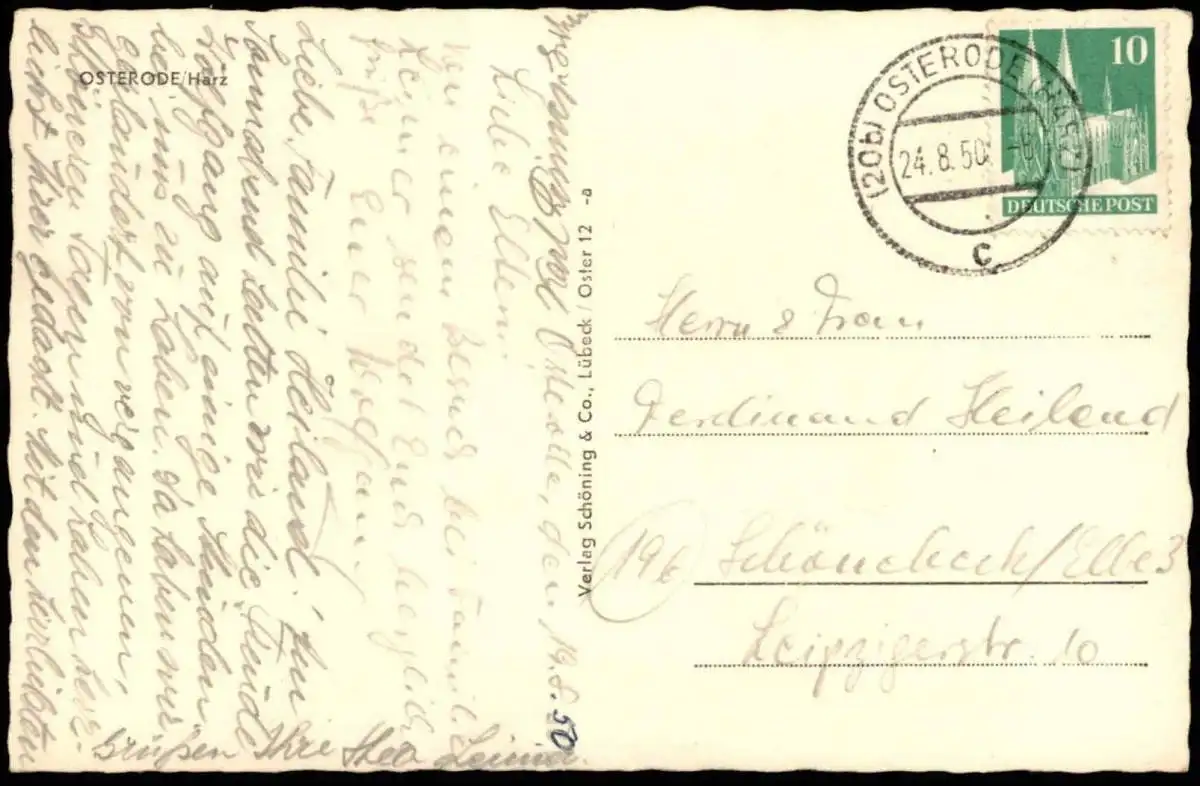 Gelaufen: 24.08.1950 mit Stempel Osterode nach Schönebeck Elbe