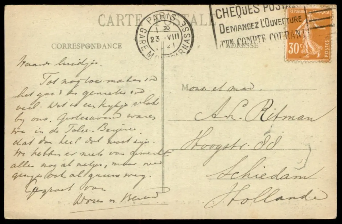 Gelaufen: 23.08.1921 mit Stempel Paris nach Schiedam