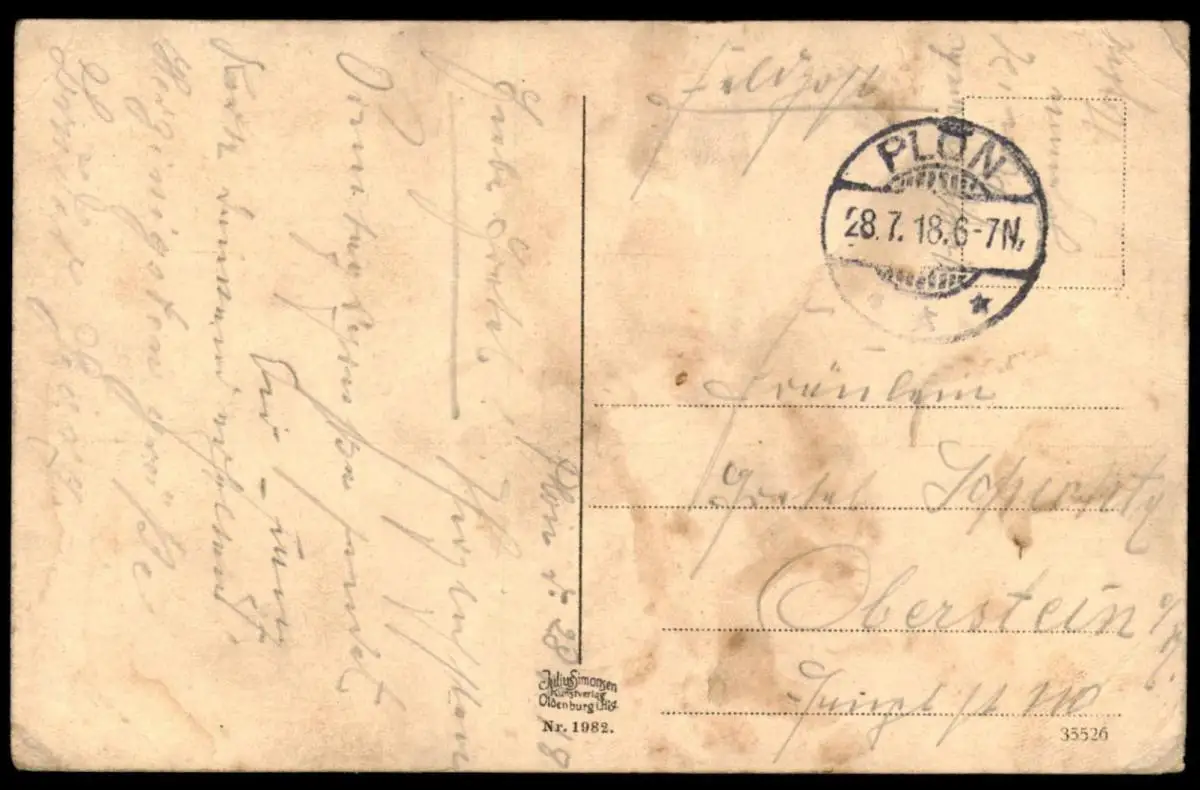 Gelaufen: 28.07.1918 als Feldpost mit Stempel Plön nach Oberstein