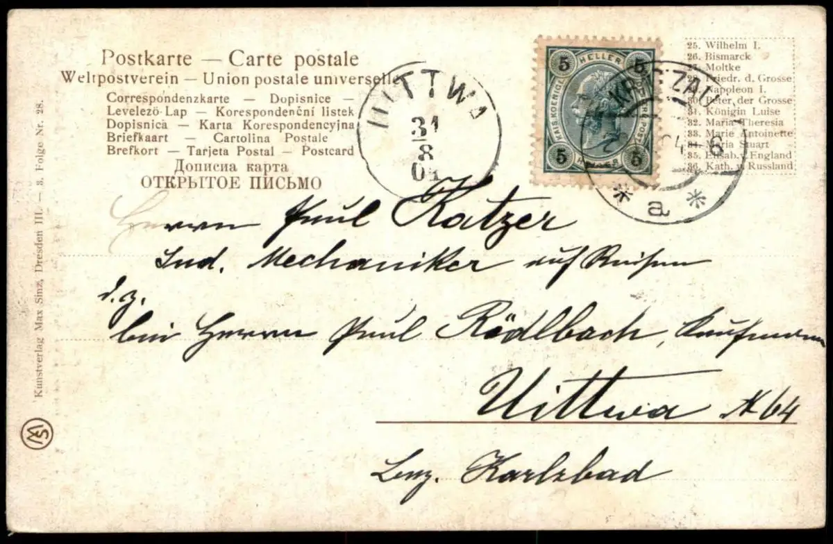 Gelaufen: 31.08.1904 nach Uittwa Bezirk Karlsbad