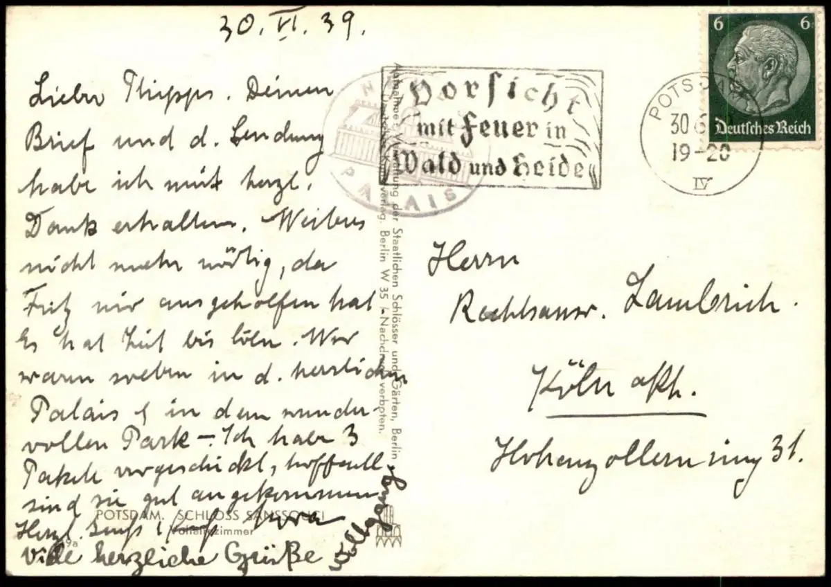 ALTE POSTKARTE POTSDAM SCHLOSS SANSSOUCI VOLTAIREZIMMERVerlag: Deutscher Kunstverlag BerlinGelaufen: 30.06.1939 mit Stempel Potsdam sowie Werbestempel "Vorsicht mit Feuer in Wald und Heide" nach KölnErhaltung (s. Scan): gut / 917736