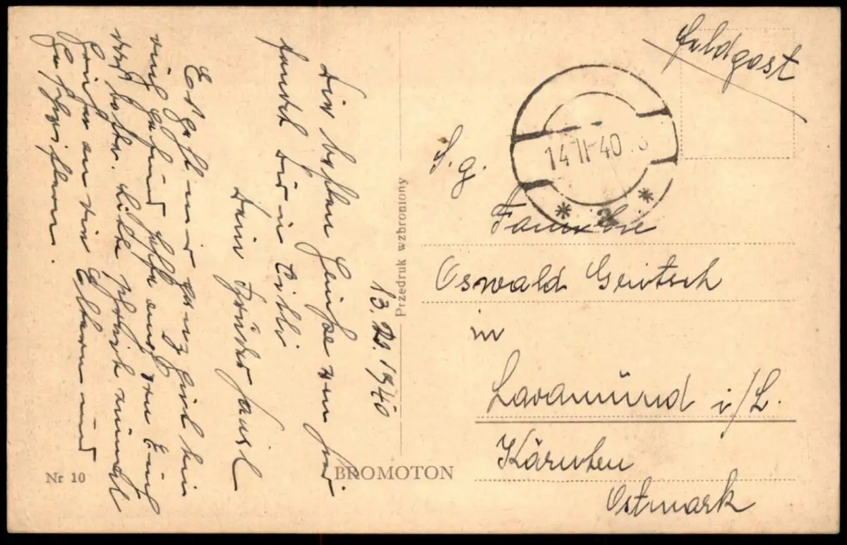 Gelaufen: 14.11.1940 als Feldpostkarte nach Lavamünd KärntenErhaltung (s. Scan): gut - sehr gut, linke untere Ecke minimal bestoßen / 916042