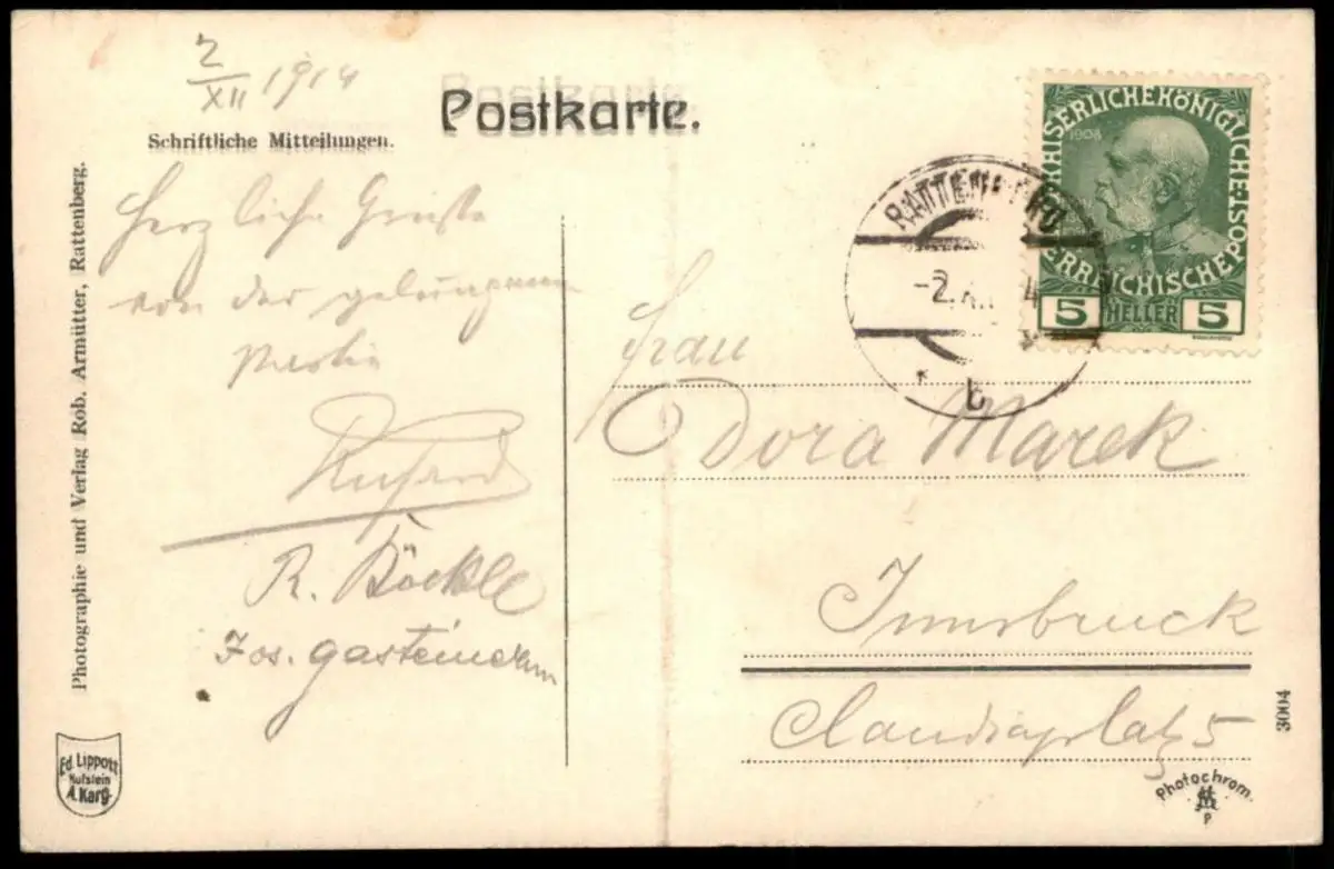 ALTE POSTKARTE RATTENBERG TIROLVerlag: Rob. Armütter, RattenbergGelaufen: 02.12.1914 mit Stempel Rattenberg nach Innsbruck