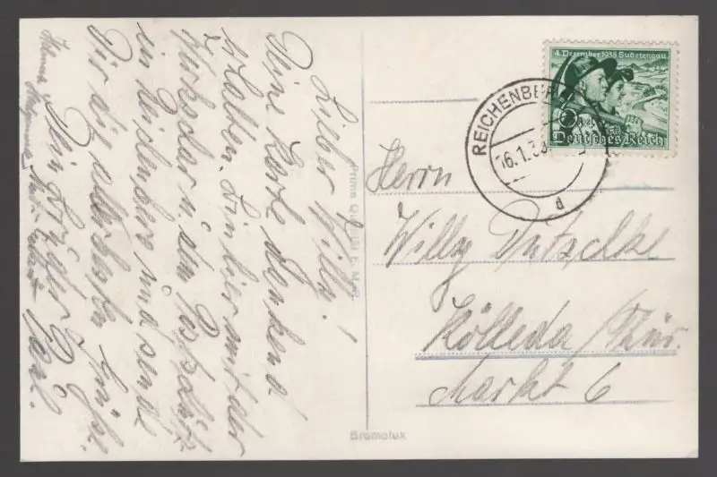 Gelaufen: 16.01.1939 mit Stempel Reichenberg nach Kölleda