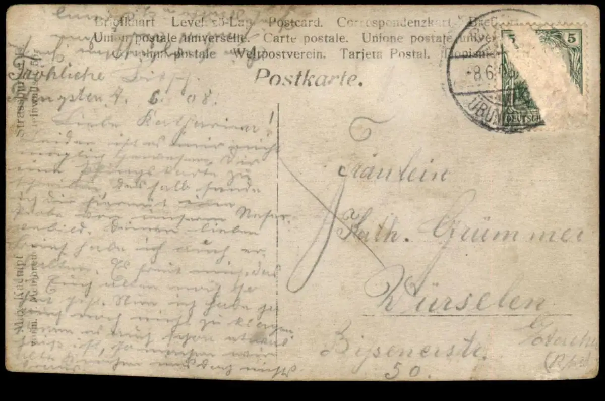 Gelaufen: 08.06.1908 nach Würselen, Briefmarke teilweise entfernt