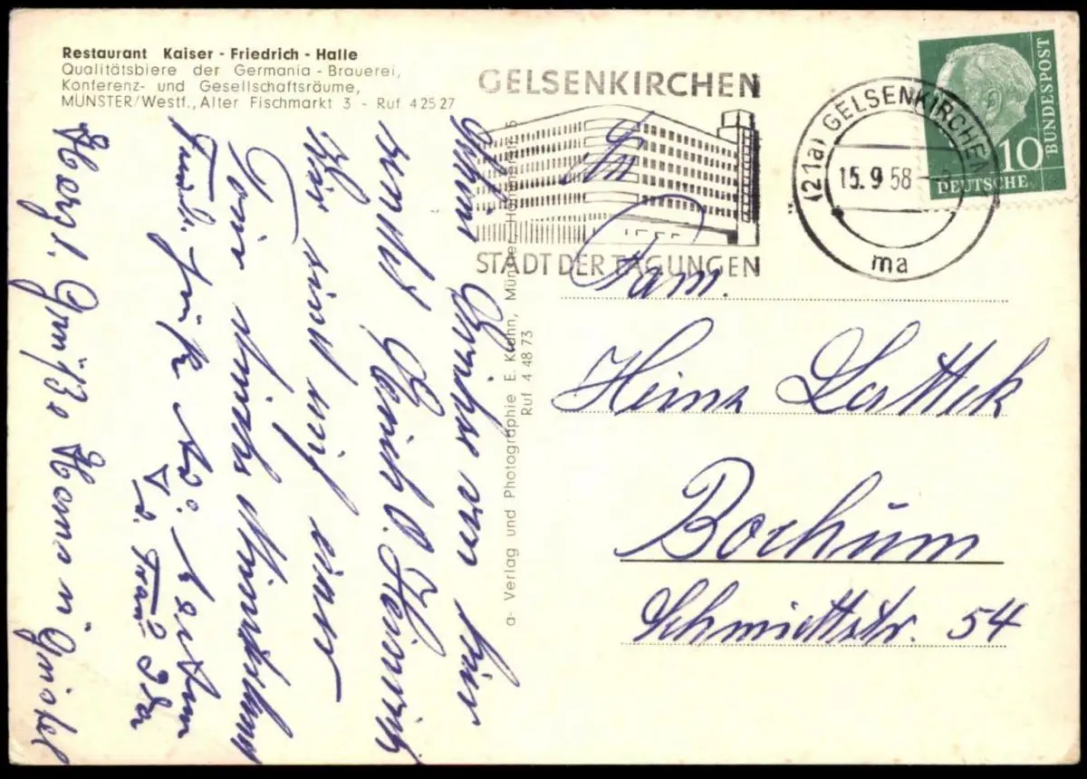Gelaufen: 15.09.1958 mit Stempel Gelsenkirchen nach Bochum