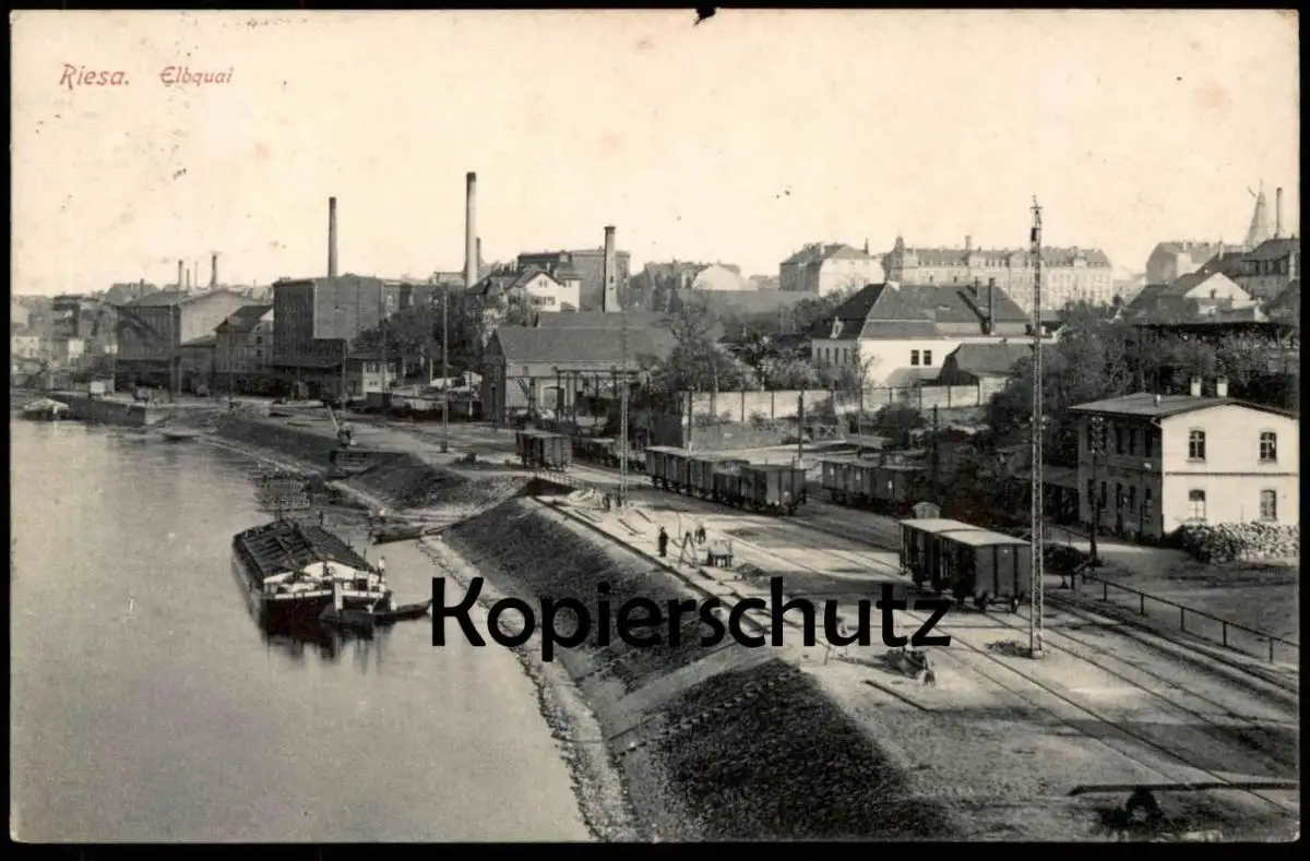 ALTE POSTKARTE RIESA ELBQUAI KAI ELBE FRACHTSCHIFF SCHIFF WAGGONS ZUG WAGGON SCHIENE FRACHT cargo AK postcard cpa