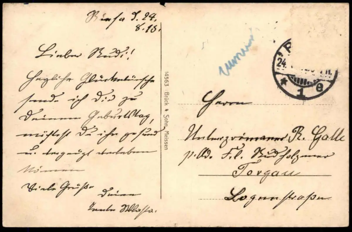 Verlag: Brück & Sohn, Meissen Gelaufen: 24.08.1915 mit Stempel Riesa nach Torgau, Briefmarke (sauber) entferntErhaltung (s. Scan): mittel, oben mittig minimale Beschädigung / 917817