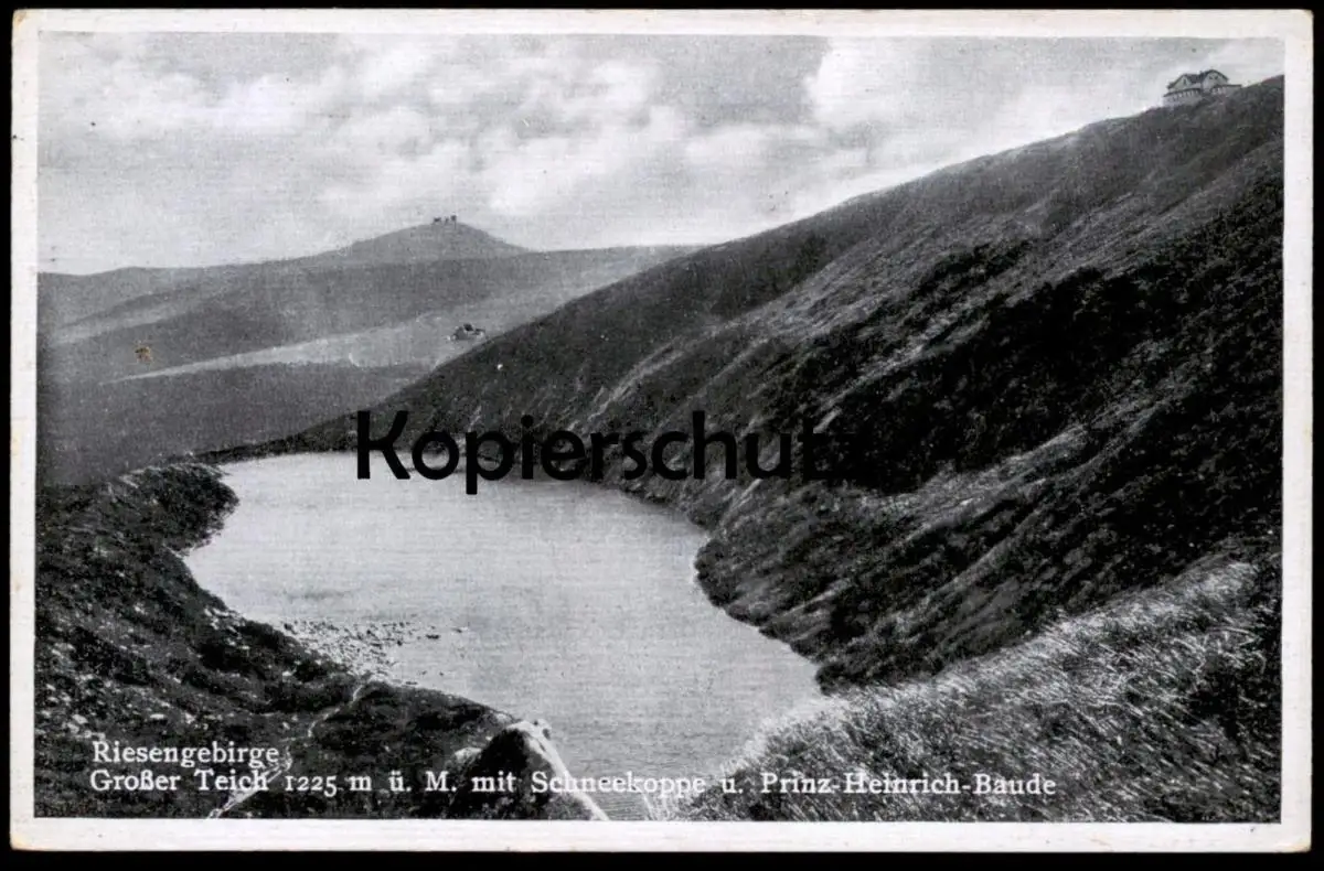 ALTE POSTKARTE RIESENGEBIRGE GROSSER TEICH 1225 M Ü. M. MIT SCHNEEKOPPE UND PRINZ-HEINRICH-BAUDE Schlesien Krkonose cpa