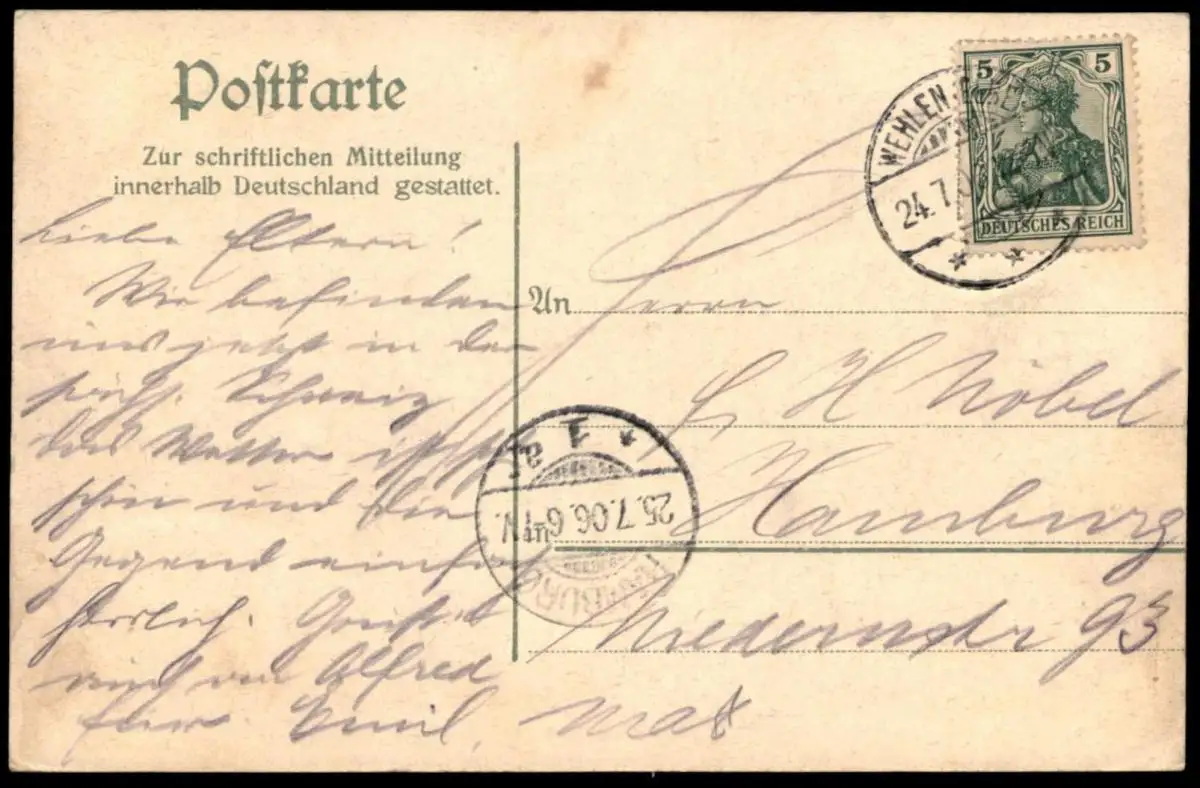 Gelaufen: 24.07.1906 mit Stempel Wehlen Elbe sowie Ankunftsstempel Hamburg 25.07.1906Erhaltung (s. Scan): gut / 917298