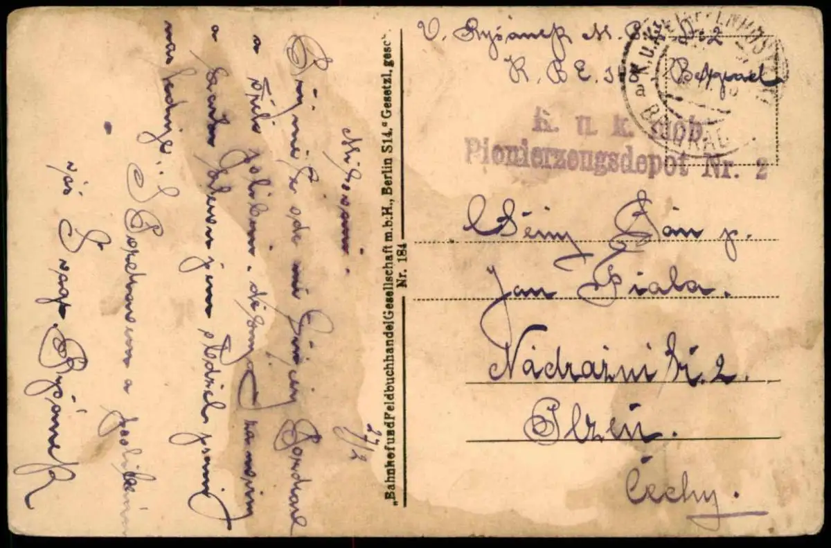 Gelaufen: 27.02.1916 nach Plzen, Stempel K. u. k. Pionierzeugsdepot Nr. 2