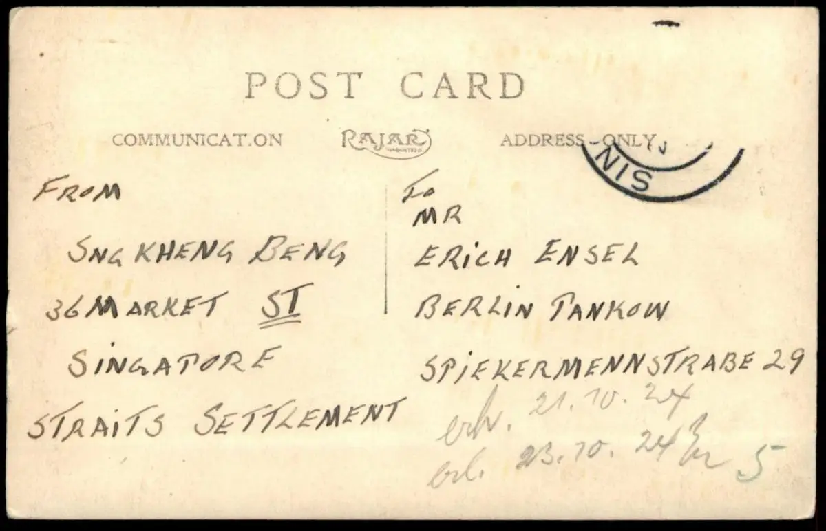 ALTE POSTKARTE SINGAPOREVerlag: unbekanntGelaufen: 21.10.1924 mit Stempel Singapore nach Berlin Pankow, Briefmarke (sauber) entferntErhaltung (s. Scan): gut, Rand rechtsseitig leicht bestoßen / 915643